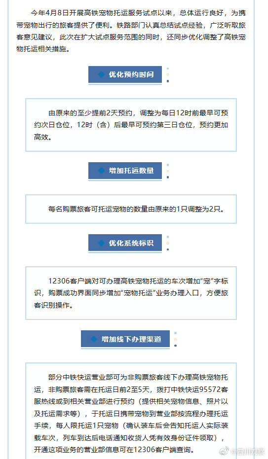 此前据中铁快运创达盈,高铁宠物托运服务自4月8日开展试点。10月15日,铁路部门第三次扩大高铁宠物托运服务试点范围,办理高铁宠物托运业务的高铁站总数达到40个,高铁列车由38趟增至54趟,具体办理线路和车次可通过铁路12306客户端查询。在扩大试点服务范围的同时,还同步优化调整了高铁宠物托运相关措施。